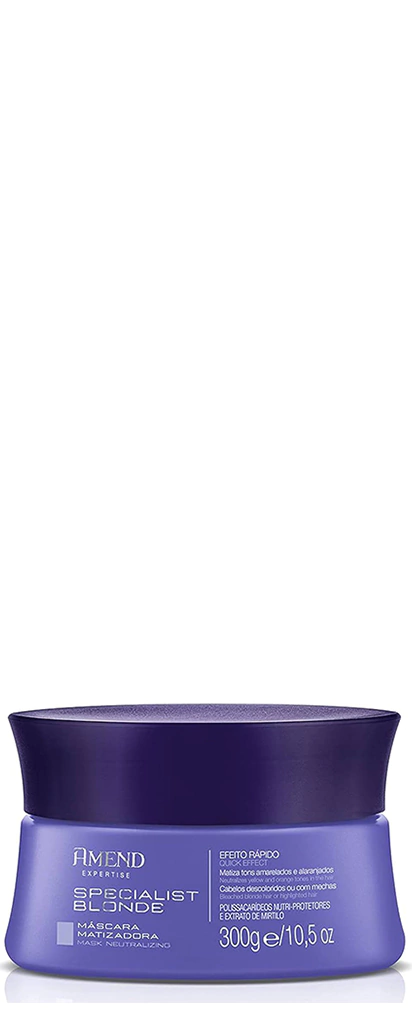 Máscara Matizadora Amend Expertise Specialist Blondecom alta concentração de pigmentos, proporciona efeito matizador imediato, neutralizando os indesejáveis tons amarelados ou alaranjados. Fórmula intensificada com aminoácidos fortalecedores e antioxidantes que doam brilho, fortificam e recuperam os fios porosos e danificados, deixando-os mais resistentes.