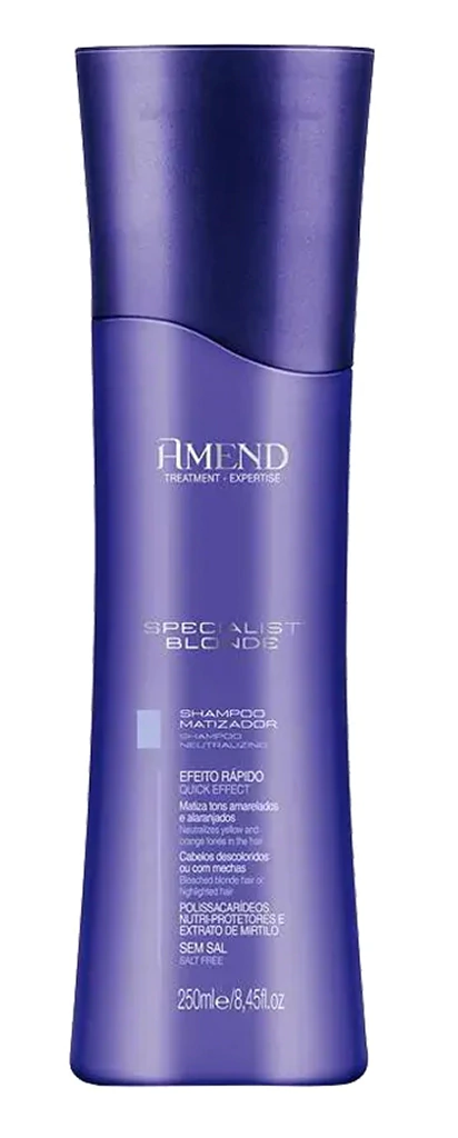 Shampoo Matizador Amend Expertise Specialist Blonde fórmula intensificada com antirradicais livres, antioxidantes, vitaminas e pigmentos concentrados de excelente afinidade com os fios. Com imediato efeito matizador, neutraliza os indesejáveis tons amarelados ou alaranjados. Promove reconstrução do fio danificado pela descoloração, atuando como agente fortalecedor.